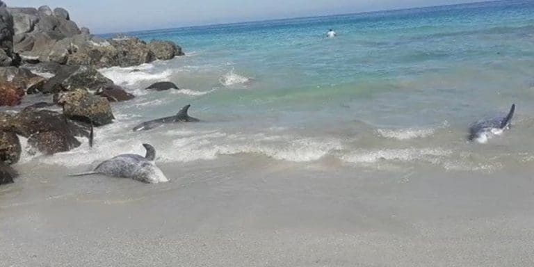 البلاغ وصل من أحد الصيادين بوجود (8) دلافين على الشاطئ، واتجه الفريق للتعرف على الدلافين من نوع ريسو، واستغرق العمل لحوالي (4) ساعات لارجاع الدلافين للبحر”.
