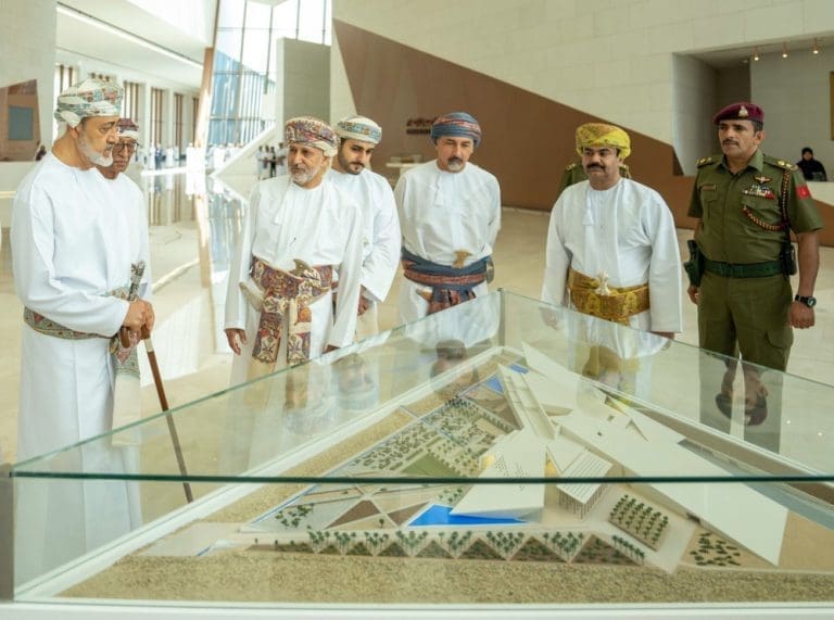 بعدها، تجوّل جلالة السُّلطان المعظّم – حفظه الله ورعاه – في أروقة المتحف مستمعًا إلى موجز لأبرز الأجنحة التي يتضمنها المتحف في قاعة التاريخ وقاعة عصر النهضة المباركة، إضافةً إلى قاعة المستقبل والتي ضمّت المشاريع الثلاثة الفائزة في الدورة الثانية من جائزة بلعرب بن هيثم للتصميم المعماري.