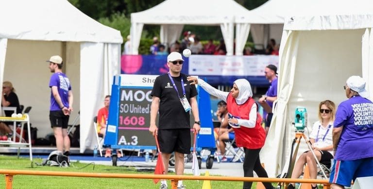 اللاعبة شادية بنت عوض الشكيلية حصلت على ميدالية المشاركة نظير حصولها على المركز الرابع في منافسات دفع الجلة.