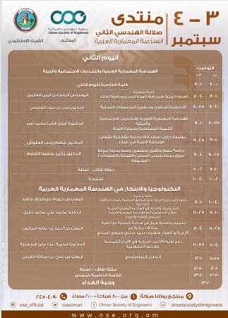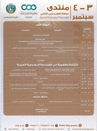 تنظم جمعية المهندسين العمانية بالتعاون مع بلدية ظفار المنتدى الهندسي الثاني تحت عنوان “الهندسة المعمارية العربية”. يستضيف المنتدى الذي يُعقد في الفترة من ٣ إلى ٤ سبتمبر بمدينة صلالة مجموعة من الخبراء والمتخصصين في مجال الهندسة المعمارية من مختلف أنحاء الوطن والعالم العربي.