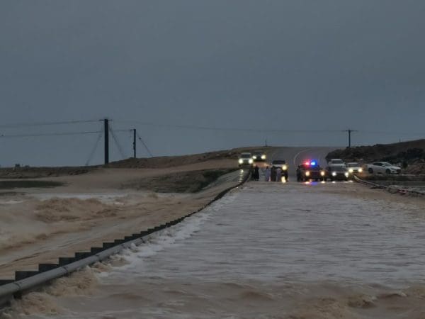 هناك إغلاقًا كليًّا لحركة المركبات على الطريق الرئيس بالقرب من خور المغسيل بشكل مؤقت بسبب تأثره بالحالة المدارية إلى جانب جريان الوادي بمنطقة عدونب بمنسوب عالٍ.