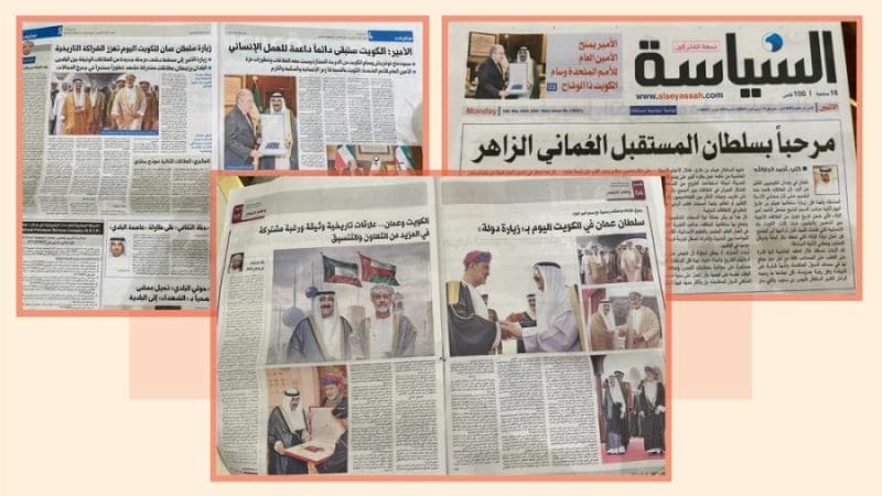 وجاءت عناوين الصحف وافتتاحياتها لتؤكد على المواقف التاريخية لسلطنة عُمان خلال العقود الثلاثة الماضية والعلاقات الأخوية الثنائية بين حكومتي وشعبي البلدين الشقيقين التي ترتكز على جذور راسخة من المحبة المتبادلة والمصير والأهداف الاستراتيجية المشتركة تحت قيادة حضرةِ صاحبِ الجلالةِ السُّلطان هيثم بن طارق المعظم وأخيه حضرةِ صاحبِ السُّمو الشيخ مشعل الأحمد الجابر الصباح ـ حفظهُما اللهُ ورعاهُما ـ.