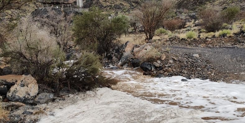 وأدى هطول الأمطار إلى جريان عدد من الشعاب وأودية العد والحربي وسني والطيب.