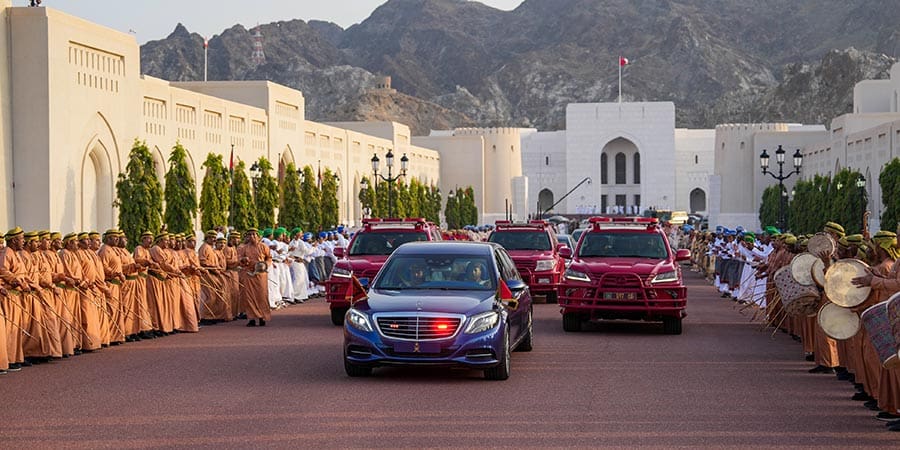ولدى عبور الموكب المقلّ للقائدين بوابة مسقط اصطفّت على جانبي الطريق مجموعة من الهجانة السُّلطانية للترحيب بسُمو الضيف، عقب ذلك حفّت كوكبة من فرسان الخيالة السُّلطانية وخيالة الحرس السُّلطاني العُماني الموكب الرسمي بمصاحبة الموسيقى العسكرية الراكبة حتى مبنى المتحف الوطني.