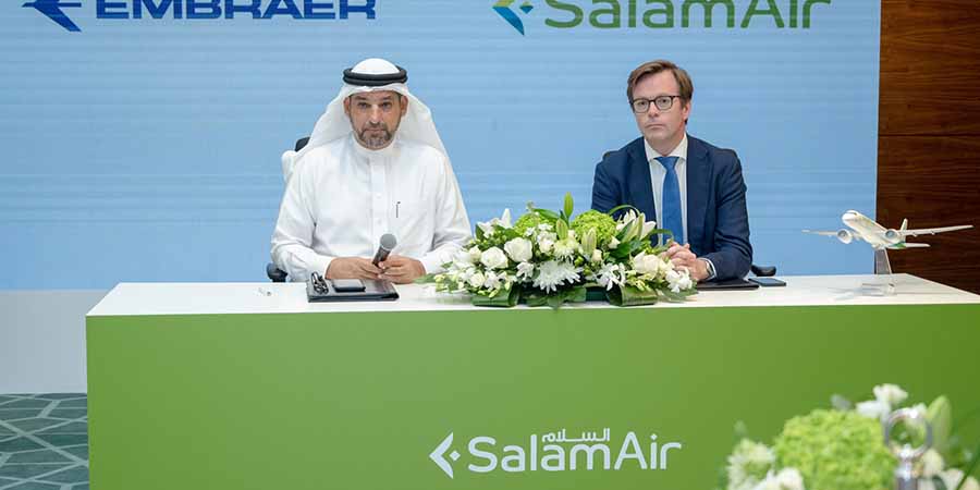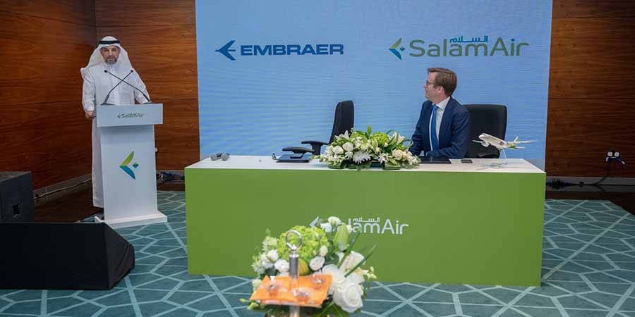 وقّع طيران السلام (الناقل الاقتصادي لسلطنة عُمان) اليوم مذكرة تفاهم مع شركة إمبراير البرازيلية لشراء 12 طائرةً من طراز “إمبراير 195 اي تو” الجديدة كليًّا، لاستخدامها في المطارات الداخلية بسلطنة عُمان والمطارات الإقليمية.
