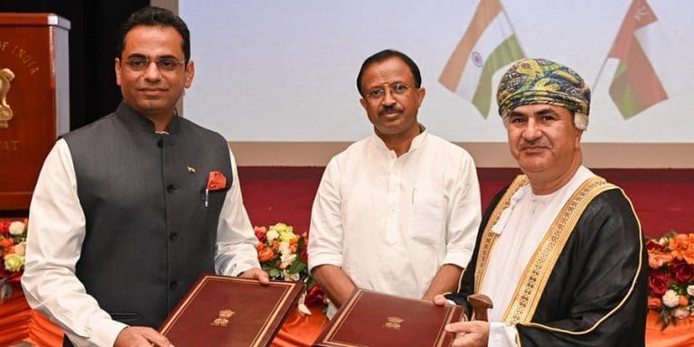 إبراهيم بن سيف العزري المدير العام ورئيس التحرير ومن جانب وكالة آسيان نيوز إنترناشيونال الهندية سعادة أميت نارنغ سفير جمهورية الهند المعتمد لدى سلطنة عُمان بحضور معالي شري ف. موراليدهاران وزير الدولة للشؤون الخارجية الهندي بمقر السفارة الهندية بمسقط.