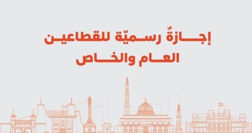 بمناسبة قرب حلول عيد الفطر المبارك لعام 1446هـ، وبناءً على التوجيهات السامية لحضرة صاحب الجلالة السُّلطان هيثم بن طارق المُعظّم ـ حفظهُ اللهُ ورعاهُ ـ فقد تقرّر أن تكون إجازة عيد الفطر للموظفين في وحدات الجهاز الإداري للدولة وغيرها من الأشخاص الاعتبارية الأخرى والعاملين في منشآت القطاع الخاص ابتداءً من يوم السبت 29 من رمضان 1446هـ الموافق 29 من مارس 2025م، على أن تنتهي الإجازة.