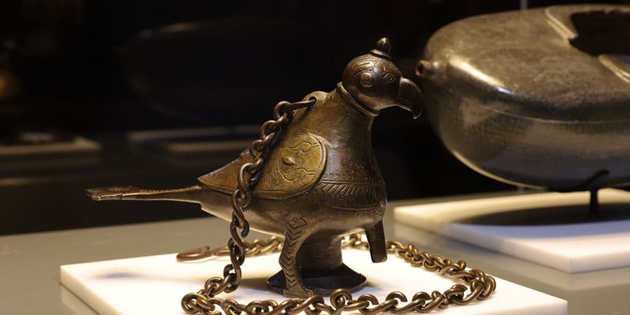 يضم المعرض مبخرة على شكل قطة مصنوعة من خليط النحاس.