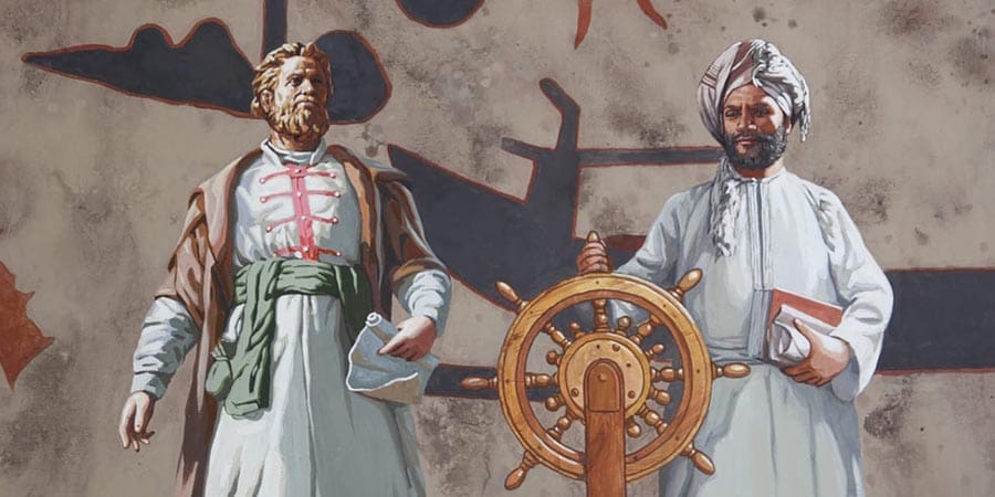 تصميمه من الإرث البحري العريق الذي يربط بين البلدين، مجسّدًا شخصيتين بارزتين من القرن الخامس عشر الميلادي كان لهما دور محوري في تطوير فنون الملاحة والمعرفة الجغرافية هما الرحّالة العُماني الشهير أحمد بن ماجد السعدي، الذي قدّم إسهامات علمية رائدة في وصف البحار والمواقع الجغرافية، ومنها بحر قزوين ومدينة دربند، والتاجر والرحالة الروسي أفاناسي نيكيتين، أول روسي يزور شبه الجزيرة العربية، والذي وثّق في مؤلفاته إقامة قداس عيد الفصح في مدينة مسقط، دلالةً على التسامح الديني والانفتاح الثقافي الذي عُرفت به عُمان عبر العصور.