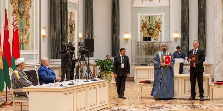 شهد حضرةُ صاحبِ الجلالةِ السُّلطان هيثم بن طارق المعظم ـ حفظهُ اللهُ ورعاهُ ـ وفخامةُ الرئيس ألكسندر لوكاشينكو رئيسُ جمهورية بيلاروس اليوم التّوقيع على اتفاقيتين و 4 مذكرات تفاهم بقصر الاستقلال في العاصمة البيلاروسية مينسك في إطار زيارة “دولةٍ” يقوم بها جلالتُه لجمهورية بيلاروس.