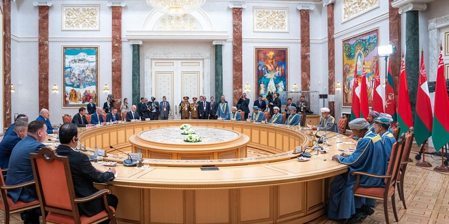 عقد حضرةُ صاحبِ الجلالةِ السُّلطان هيثم بن طارق المعظم ـ حفظهُ اللهُ ورعاهُ ـ وفخامةُ الرئيس ألكسندر لوكاشينكو رئيس جمهورية بيلاروس جلسةَ مباحثاتٍ رسميّةً موسّعةً بحضور الوفدين الرّسميين من الجانبين.